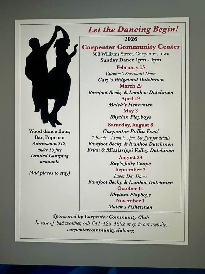 Sun 29 – Community Hall – Carpenter, IA – 1-4pm (3pc)